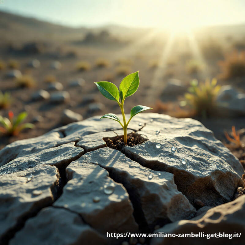 "In una crepa di roccia grigia, là dove tutto sembra ostile, un piccolo seme trova il coraggio di germogliare. Le sue radici si insinuano negli spazi più duri, cercando nutrimento, mentre il germoglio verde si allunga verso la luce. È un’immagine potente, un simbolo universale di resilienza e speranza.
